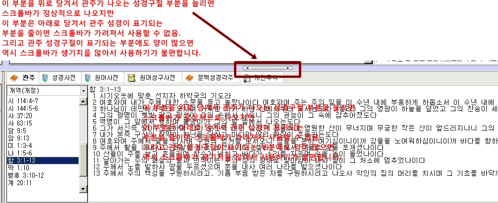 ¼º°æ±¸Àý Ç¥±â°¡ ´Ù ¾ÈµÇ´Â ¹®Á¦-¿ÞÂÊ¿¡ ¼±ÅÃµÈ °üÁÖ¸¦ º¸¸é ÇÕ 3:1-13Àý±îÁö µÇ¾î ÀÖÁö¸¸ ¿À¸¥ÂÊ ¼º°æ±¸Àý â¿¡´Â 12Àý±îÁö ¹Û¿¡ ¾Èº¸ÀÌ°í ¾Æ·¡·Î ³»¸± ¼ö ÀÖ´Â ½ºÅ©·Ñ¹Ùµµ »ý¼º¾ÈµÊ. ´Ü Á¦ÀÏ À§¿¡ ÀÖ´Â ±×¸²¿¡ ºÓÀº»ö »ç°¢¹Ú½º·Î µÈ ºÎºÐÀ» À§ÂÊÀ¸·Î ´ÃÀÌ¸é ´Ù º¸ÀÓ.