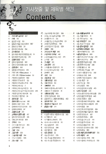 ¢Á °¡»ç ùÁÙ ¹× Á¦¸ñº° »öÀο¡´Â °¢ °îÀÇ °¡»ç ùÁÙÀ» ºñ·ÔÇÏ¿© Á¦¸ñÀÌ °¡»ç ùÁÙ°ú ´Ù¸¥ °æ¿ì ÀÌÅŸ¯Ã¼·Î Áõº¹ »ðÀԵǾî ÀÖÀ¸¸ç ¿µ¹®Á¦¸ñº° »öÀο¡´Â ÇÑ±Û Á¦¸ñµµ °°ÀÌ Ç¥±âÇÏ¿© °îÀ» ã´Âµ¥ ¾î·Á¿òÀÌ ¾øµµ·Ï ÇÏ¿´½À´Ï´Ù. ±×¸®°í ÁÖÁ¦ ¹× Á¶º° »öÀÎÀº ¿¹¹è³ª Âù¾ç¸ðÀӽà ¼±°îÀ» À§ ÇÏ¿© °¢ °îµéÀ» ÇÑ ÁÖÁ¦ ¾È¿¡¼ Á¶(Key)º°·Î Á¤¸®ÇÏ¿´°í, ÆäÀÌÁö ±¸ºÐÀ» ÅëÇØ ½Å°îÀ̳ª Âù¾çÄÜÆ¼ ÀÛ¼º¿¡ À¯¿ëÇϵµ·Ï ÇÏ¿´½À´Ï´Ù. ¸¶Áö¸·À¸ ·Î ¼ö·ÏÀ½¹Ý»öÀÎÀº °¢°îµéÀÌ ¼ö·ÏµÇ¾î ÀÖ´Â À½¹ÝÀ» Á¶»çÇÏ¿© ±â·ÏÇÏ¿´½À´Ï´Ù.