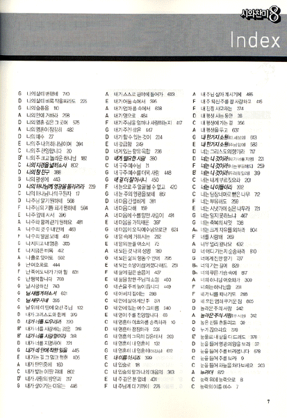 ¢Á ½Ã¿Í Âù¹Ì 8Áý¿¡ ½Ç¸° Âù¾ç°îµéÀº 6°¡Áö ÁÖÁ¦·Î ³ª´µ¾î ÆíÁýµÇ¾î ÀÖ°í, ±× ÁÖÁ¦ ¾È¿¡¼ ´Ù½Ã Äڵ庰(C(Am) - D(Bm) - E - F(Dm) - G(Em) - A)·Î ¹è¿µÇ¾î ÀÖÀ¸¸ç, Âù¾ç¸ðÀӽà ¿¬°áÇØ¼ ºÎ¸¦ ¼ö ÀÖ´Â °îµéÀ» °í·ÁÇÏ¿© ÃÖ´ëÇÑ ÇÑÆäÀÌÁö ¾È¿¡ ÆíÁýÇϵµ·Ï ³ë·ÂÇÏ¿´½À´Ï´Ù. ±×¸®°í ½Ã¿Í Âù¹Ì 8ÁýÀº Áõº¸ÆÇ ÆíÁý½Ã ÁÖÁ¦º°·Î °îÀ» Ãß°¡ ÇÒ ¼ö ÀÖµµ·Ï ÁÖÁ¦º°·Î °íÀ¯¹øÈ£(100´ÜÀ§, 50´ÜÀ§)¸¦ ºÎ¿©ÇÏ¿© Âù¾ç°îµéÀÇ ¹ø È£°¡ º¯ÇÏÁö ¾Êµµ·Ï ÇÏ¿´½À´Ï´Ù.